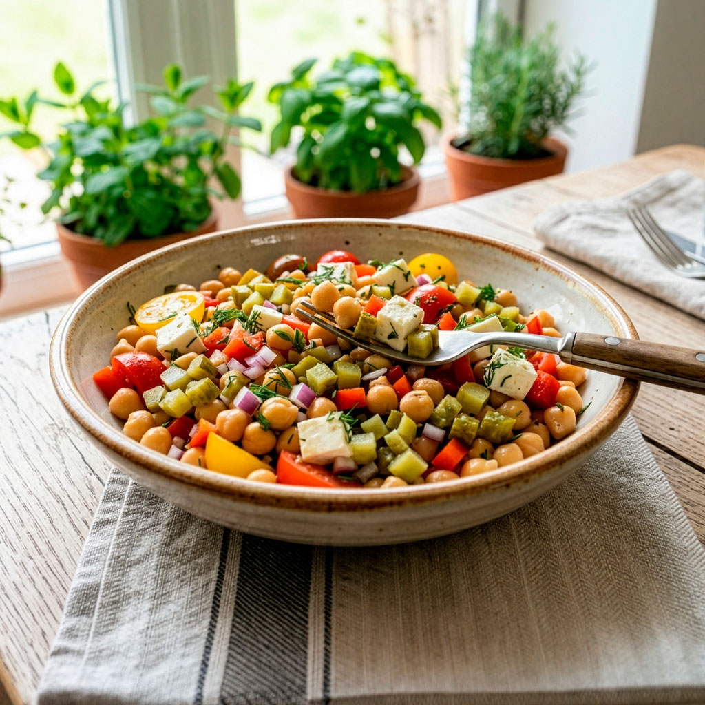 1. En un bol grande, mezcla los garbanzos con los vegetales frescos.